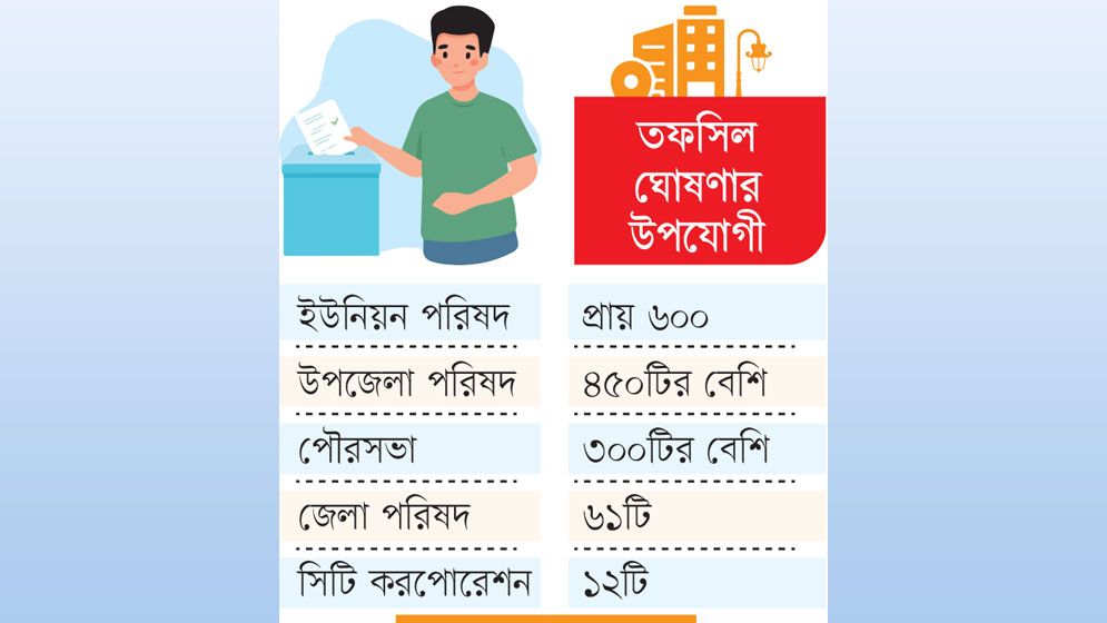 নির্বাচন উপযোগী প্রতিষ্ঠানের মধ্যে রয়েছে-১২টি সিটি করপোরেশন, ৪৫০টির বেশি উপজেলা পরিষদ, তিনশর বেশি পৌরসভা, প্রায় ছয়শ ইউনিয়ন পরিষদ এবং ৬১টি জেলা পরিষদ। এছাড়া আগামী জুলাই মাসের মধ্যে আরও দুই হাজার আটশর বেশি ইউনিয়ন পরিষদ তফসিল ঘোষণার জন্য উপযোগী হবে।
